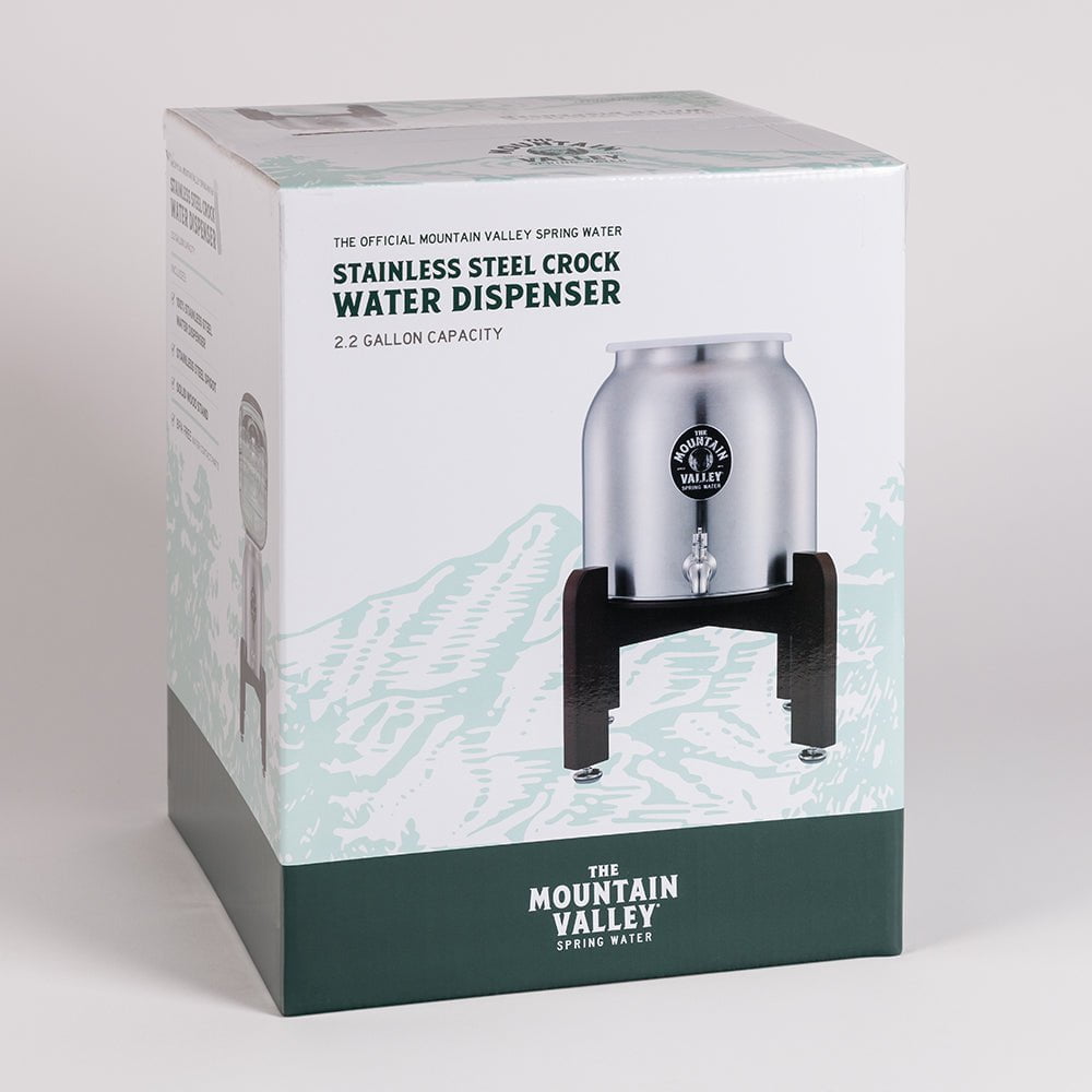 The Official Mountain Valley Spring Water branded stainless steel crock water dispenser with stainless steel spigot and solid wood tabletop stand. ?(Water Jug Not Included)
